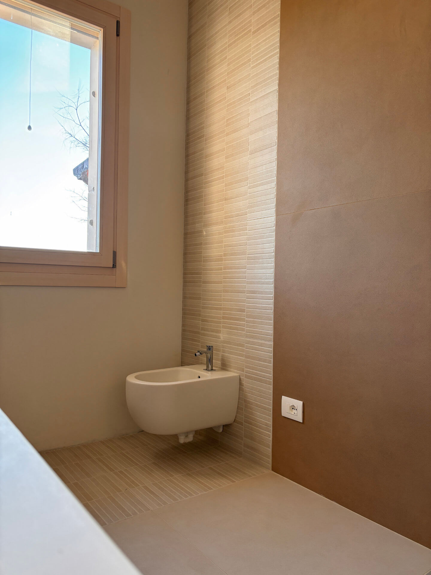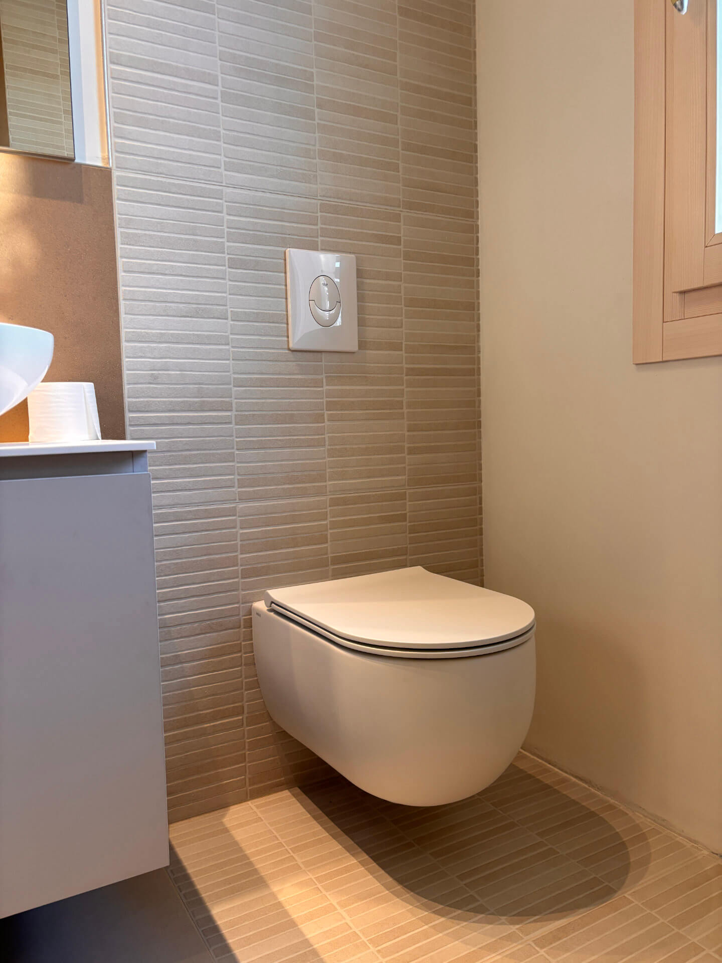 Rivestimento a listelli orizzontali (muretto) nella zona sanitari sospesi,