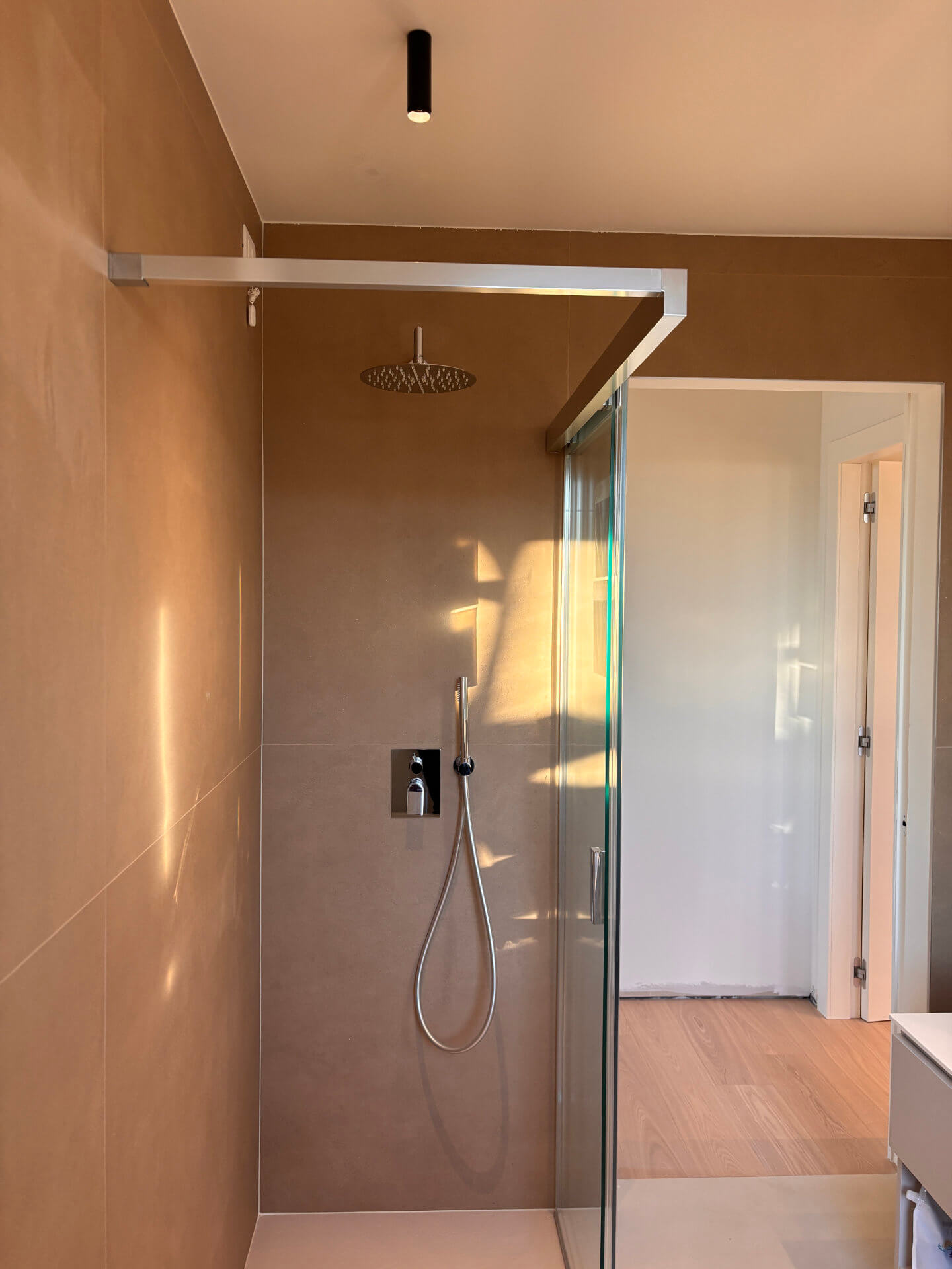 Grandi lastre effetto resina/cemento per pareti e zona doccia.