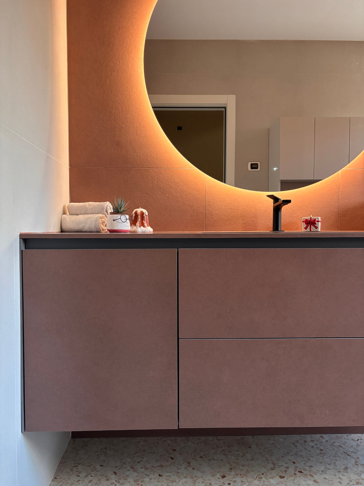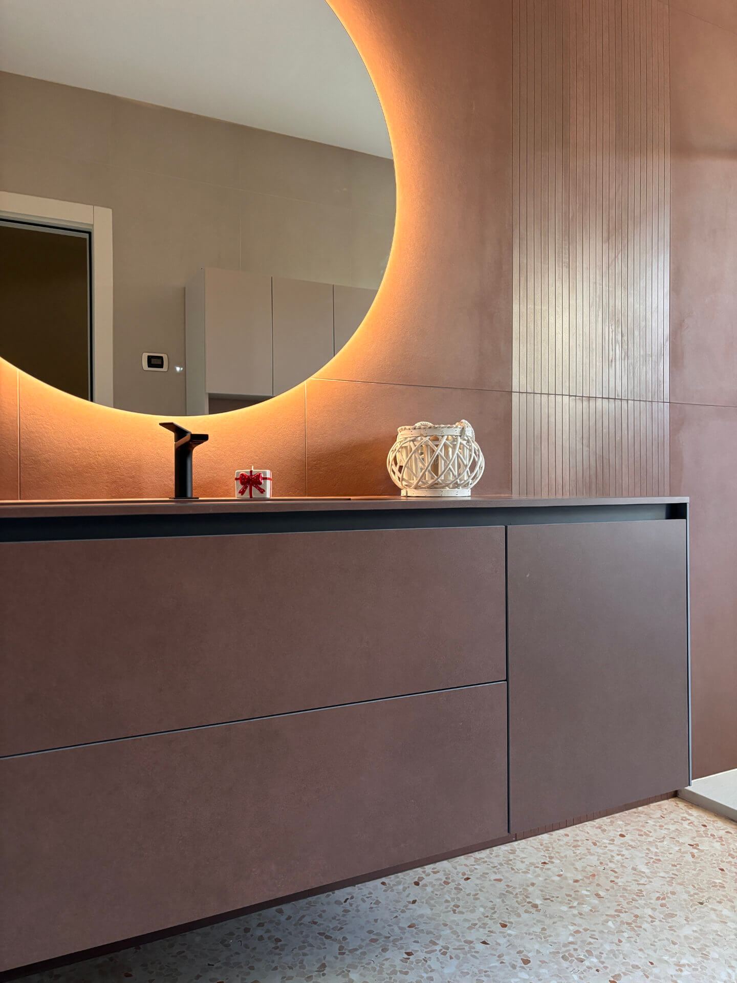 Il risultato è un ambiente bagno elegante e contemporaneo, in cui materiali,