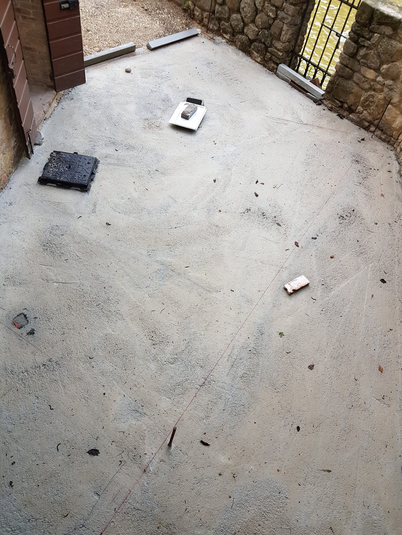 Nella seconda fase si è provveduto all’esecuzione del getto di allettamento in calcestruzzo, eseguito calcolando le giuste linee di pendenza e le quote finali di pavimento finito ( foto 2 ).