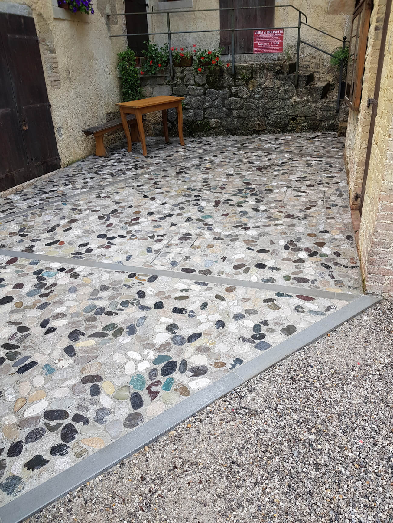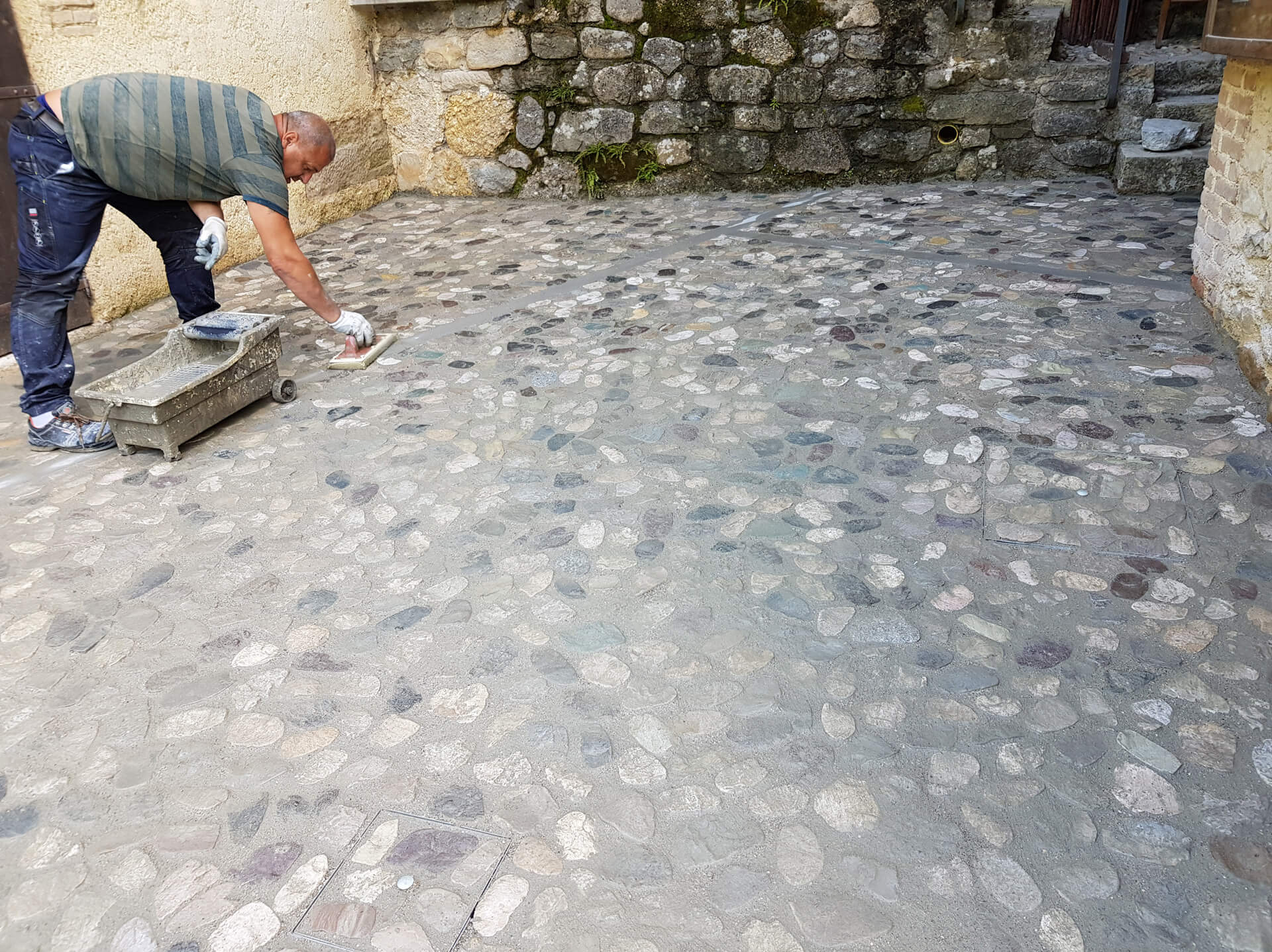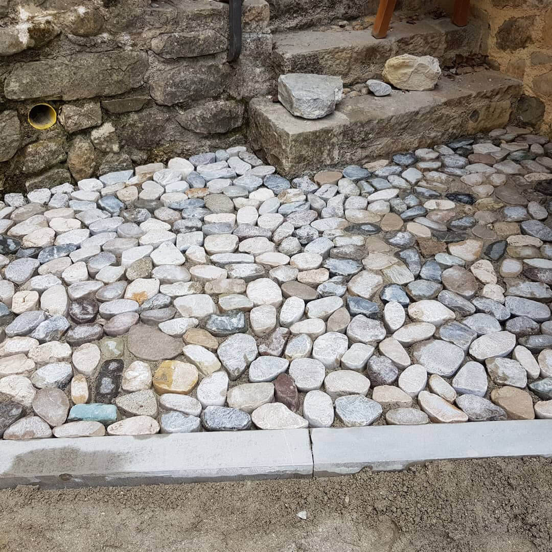 Di pari passo si è pure avviata la posa di ciottoli di fiume che sono stati tranciati a metà e sottoposti ad una leggera burattatura avente lo scopo di smussare le asperità, gli spigoli taglienti e conferire ai conci un aspetto consumato ed anticato.