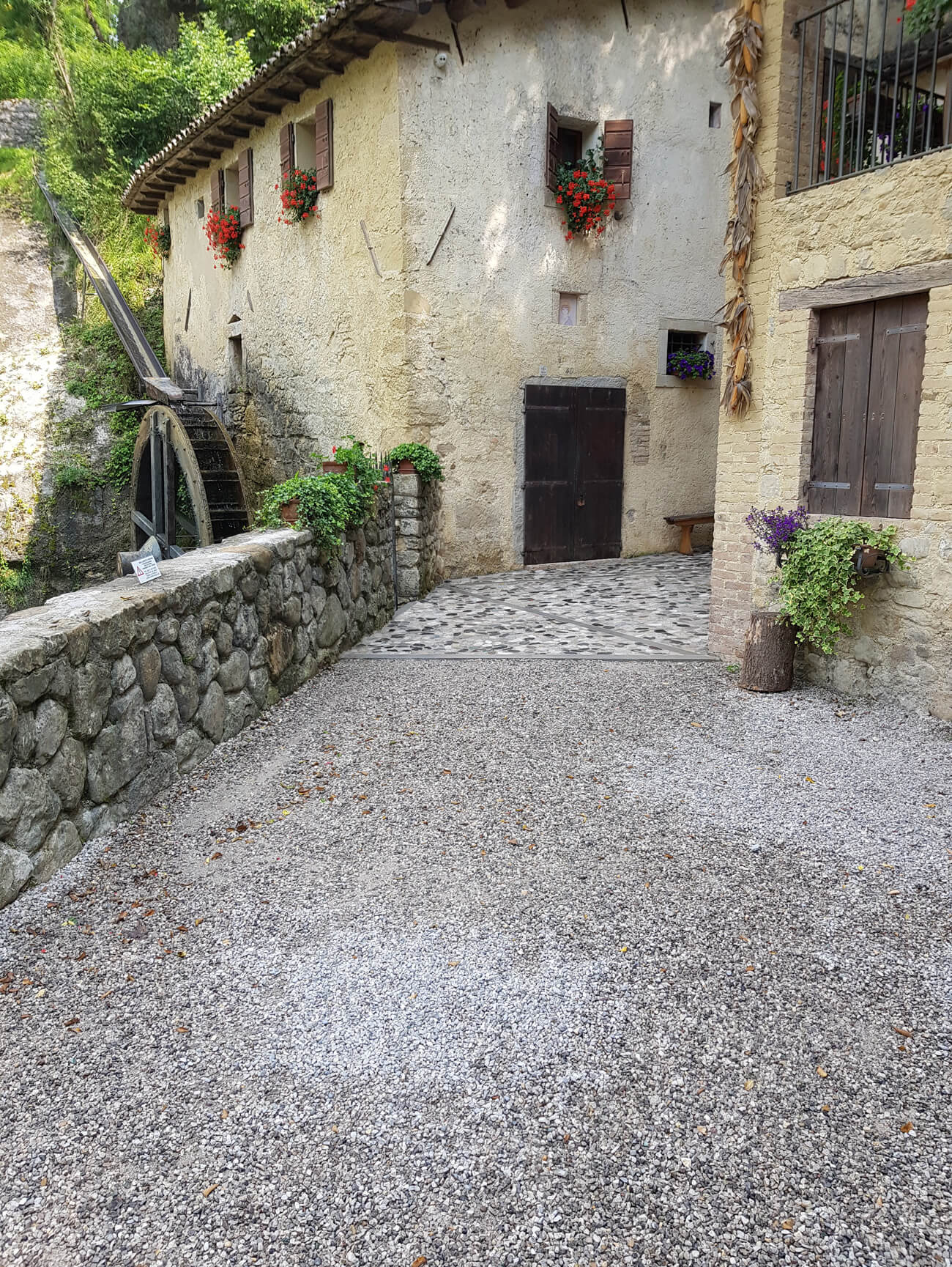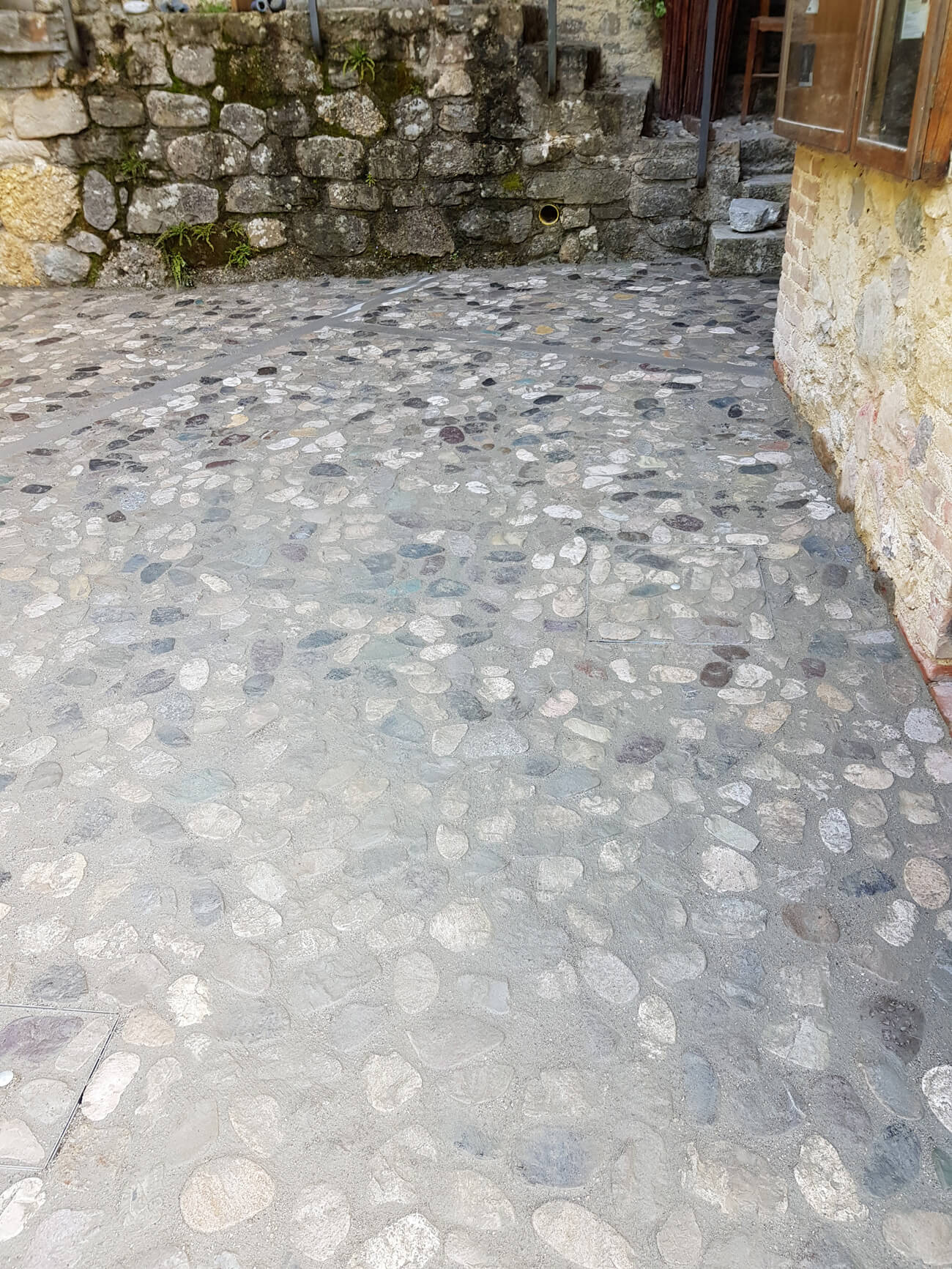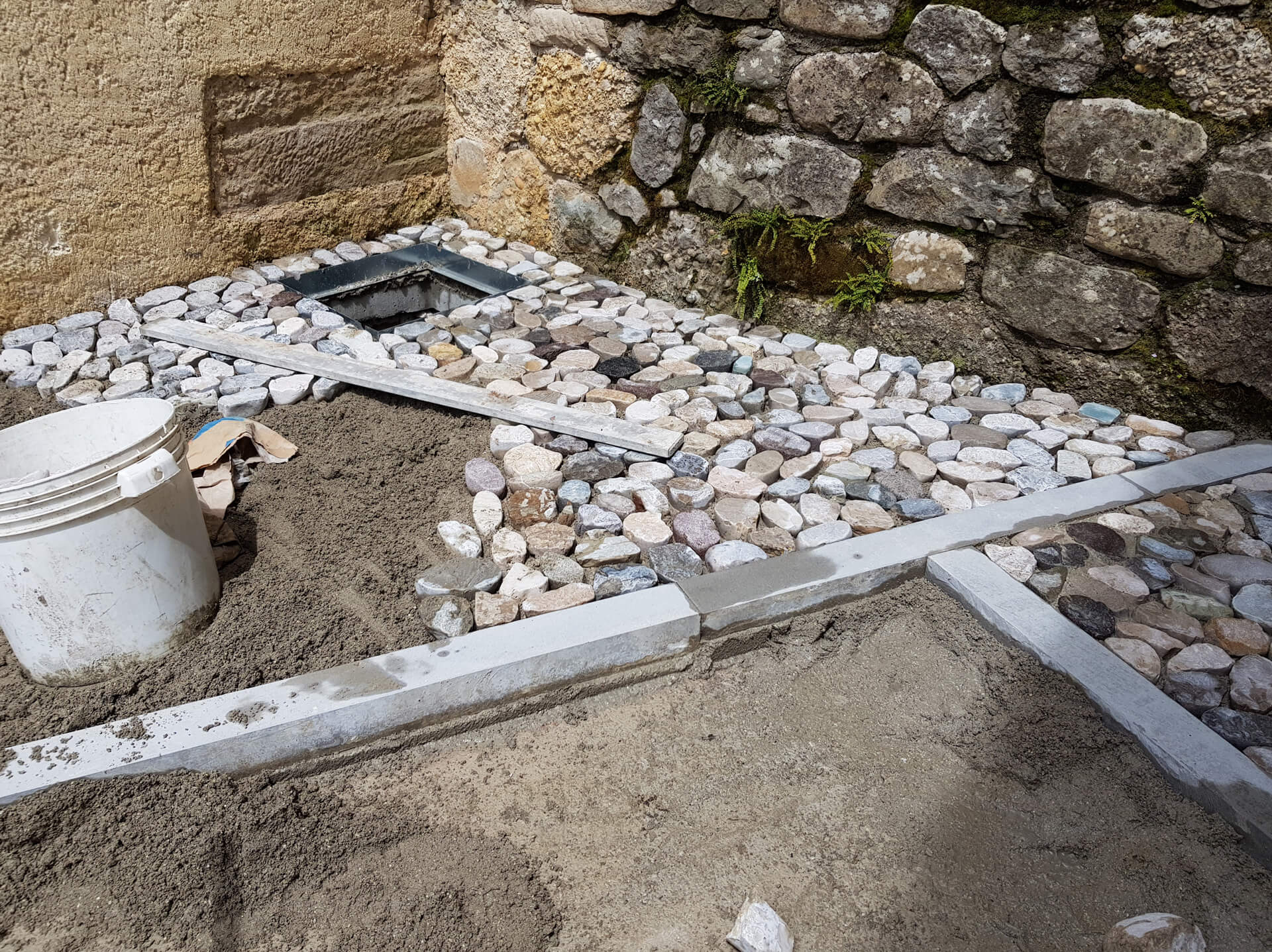 Di pari passo si è pure avviata la posa di ciottoli di fiume che sono stati tranciati a metà e sottoposti ad una leggera burattatura avente lo scopo di smussare le asperità, gli spigoli taglienti e conferire ai conci un aspetto consumato ed anticato.