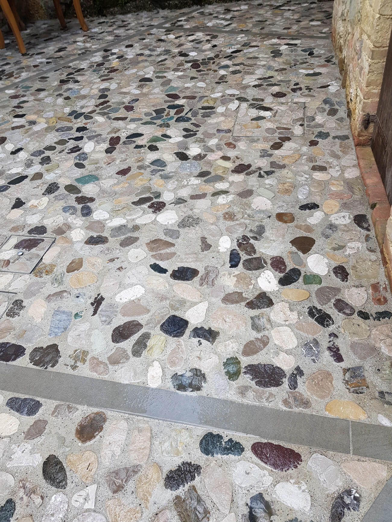 Trascorso un periodo di maturazione di circa 30 giorni, il pavimento è stato sottoposto a lavaggio con una soluzione di acido solfammico subito tamponata con un detergente alcalino ( foto 7 ); in questa fase è stata rimossa la patina cementizia di lavorazione, riportando i ciottoli alle loro brillanti e naturali tonalità (foto 8 ).